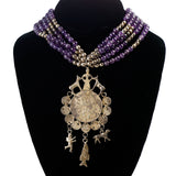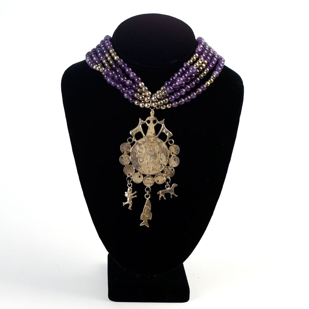 Note: Vintage Amethyst and silver beaded necklace with a large Peruvian coin pendant and three charms. The necklace has 5 strands of beads.