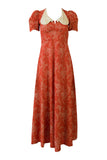 Ankle Length red floral dot print dress with silk olive oil collar. Back zip closure with tie back