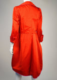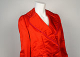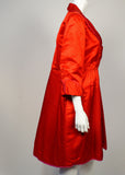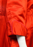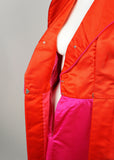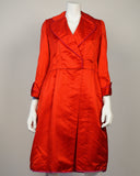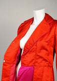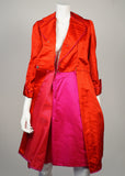 Note: 1960's-70's red satin couture coat dress with fuchsia piping and matching fuchsia under slip.