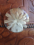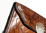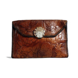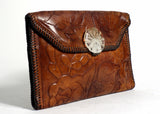 Gorgeous leather clutch hand tooled design and lucite closure, whip stitch, with cactus motif