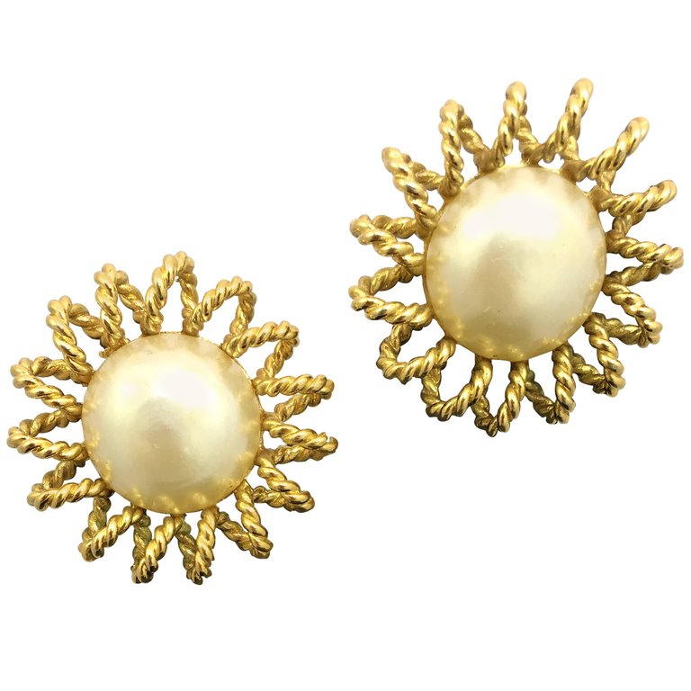 Chanel gold-tone alloy starburst clip-on earring pair with imitation pearl center.