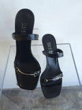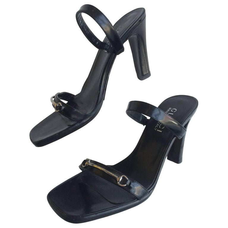 Note: Gucci black open toe sandals decorated with a silver saddle bit.