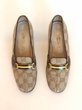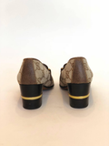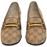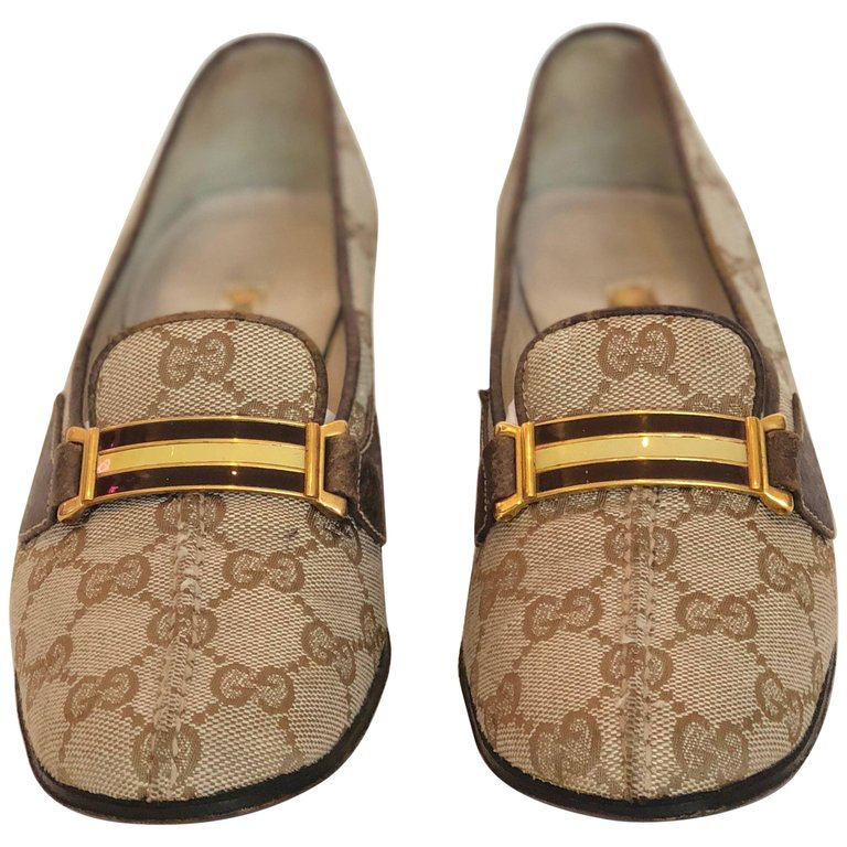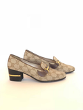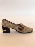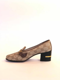 1970's Gucci logo loafer pump with enamel buckle and enamel heel inlay. Top stitch detail with a 2" heel. Italian size 35.5