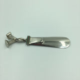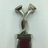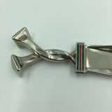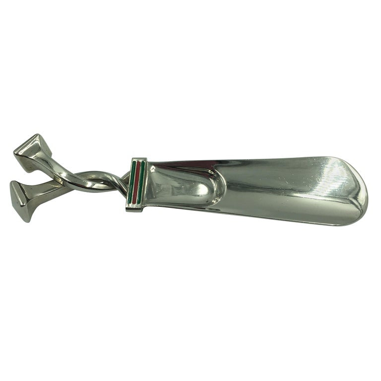 Gucci Silver with Red and Green Classic Enamel Stripe Shoehorn. Front and back feature the classic Gucci red and green stripe, in enamel paint, at bottom of twisted nail head motif handle. Stamped Gucci and Italy on back of twisted handle. No visible marks or major scratches on item.