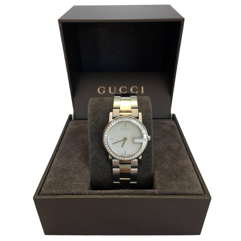 Stainless steel sapphire crystal and diamond encrusted 'G' "101L" watch from Gucci. Diamond count of 47 and TCW of 0.48. Water resistant at 3 ATM. Quartz movement. Mother of pearl face. Deployment clasp closure at the back. Reference # 101L. Serial # 10114524.