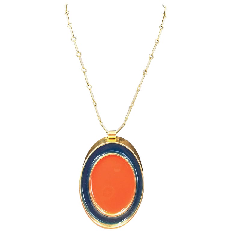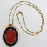 Guy Laroche Gold Tone Necklace with Red + Navy Enamel Plated Oval Pendant from the 1960's. Pendant is reversible and is the same Navy + Red design on both sides. Chain is part of the design feature. Guy Laroche tag at the back neck hook. See photo.