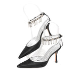 Manolo Blahnik Black Satin Pointy Toe Heel With Rhinestone Chandelier Like Ankle Strap.