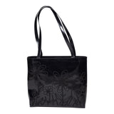 Original Moschino patent leather tote bag with black flower stitching. Drawstring closure interior.