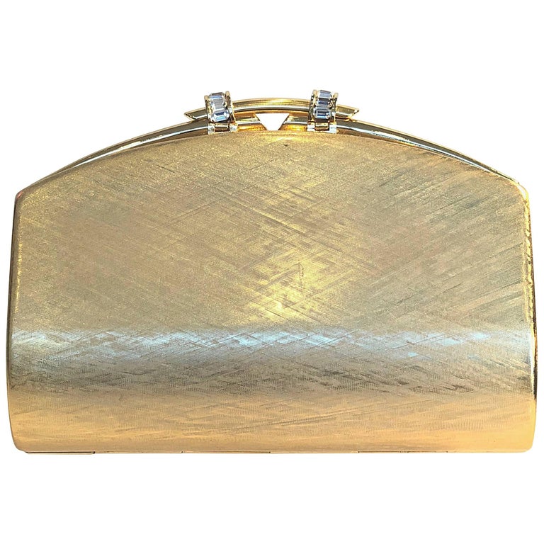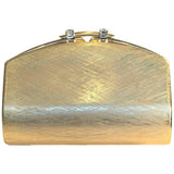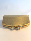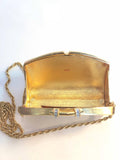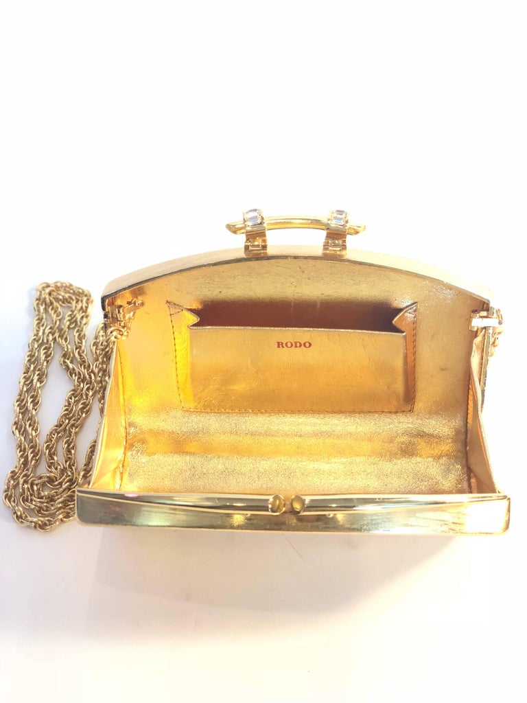 Rodo gold metal evening clutch, lined in gold leather. Converts into shoulder bag.